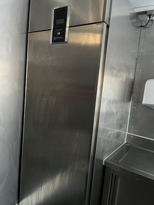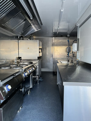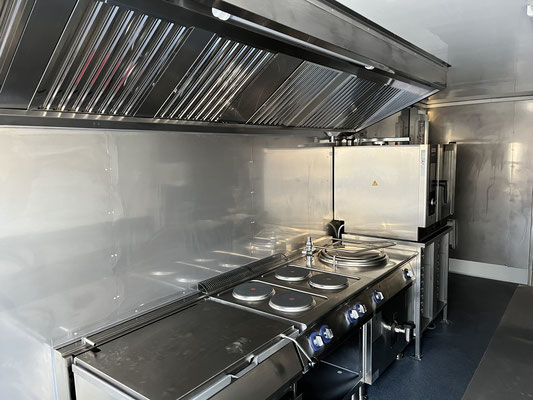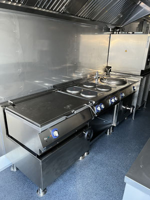 Großküchenanhänger 3500kg Gesamtgewicht mit Rational Kombidämpfer, Kippbratpfanne 60 Liter, Kochkessel 60 Liter, 4-Fach Herd, Doppelspülbecken, Abzugshaube, Schränke, Arbeitsfläche, Kühlschrank