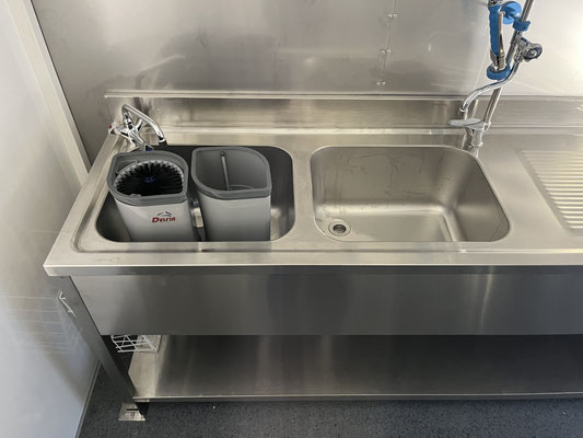 Ausstattung: 2 Stück Winterhalter UC-M Bistro Spülmaschinen für 50x50 Körbe, Doppelspülbecken mit Brausearmatur und Gläserspüler, Spülkörbe, Edelstahl Arbeitstische
